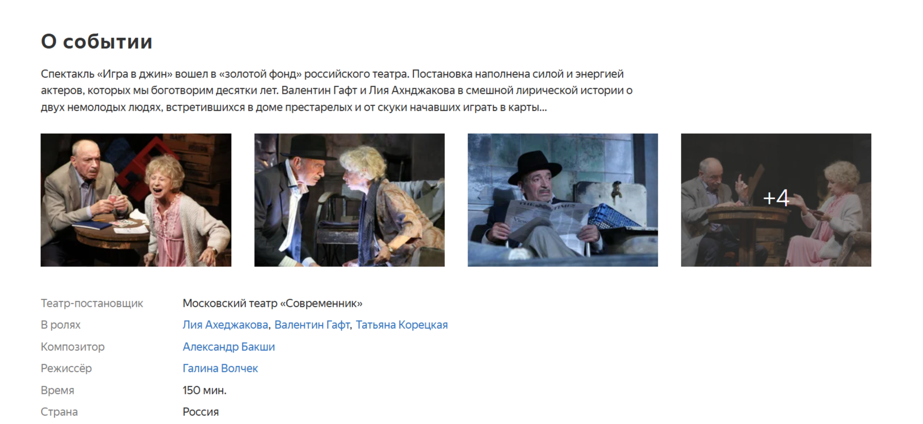 На официальном сайте ВКЗ афиша не содержит ошибок. Там действительно анонсирован спектакль «Игра в джин», но в исполнении артистов Сергея Кошонина и Ольги Кирсановой-Миропольской из другого театра. Покупка билета через сайт зала ведёт на страницу с корректной информацией.