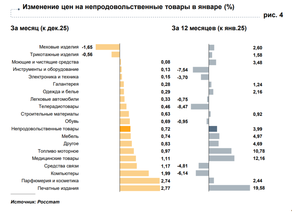 Среди непродовольственных товаров компьютеры, парфюмерия и печатная продукция подорожали на 1,9% до 2,7%. Основными причинами называют сокращение количества промо-акций в торговых сетях и повышение НДС.
