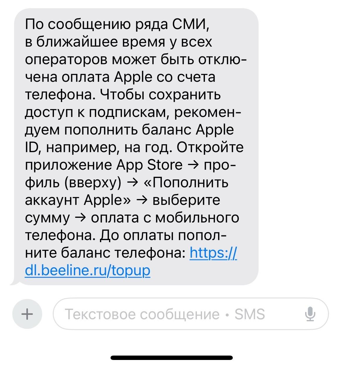 В качестве причины оператор ссылается на сообщения в СМИ о возможном скором отключении возможности оплачивать подписки на сервисы Apple с баланса мобильного номера. Чтобы сохранить доступ к подпискам, абонентам советуют внести средства на Apple ID, например, сразу на целый год.