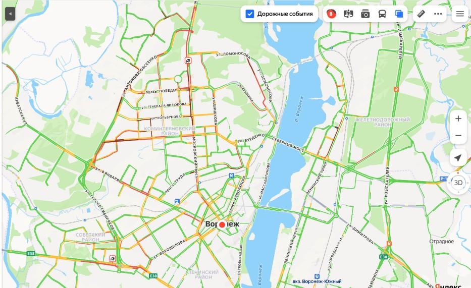 Утром 16 февраля Воронеж столкнулся с пробками интенсивностью 8 баллов. Движение было парализовано на ключевых магистралях.