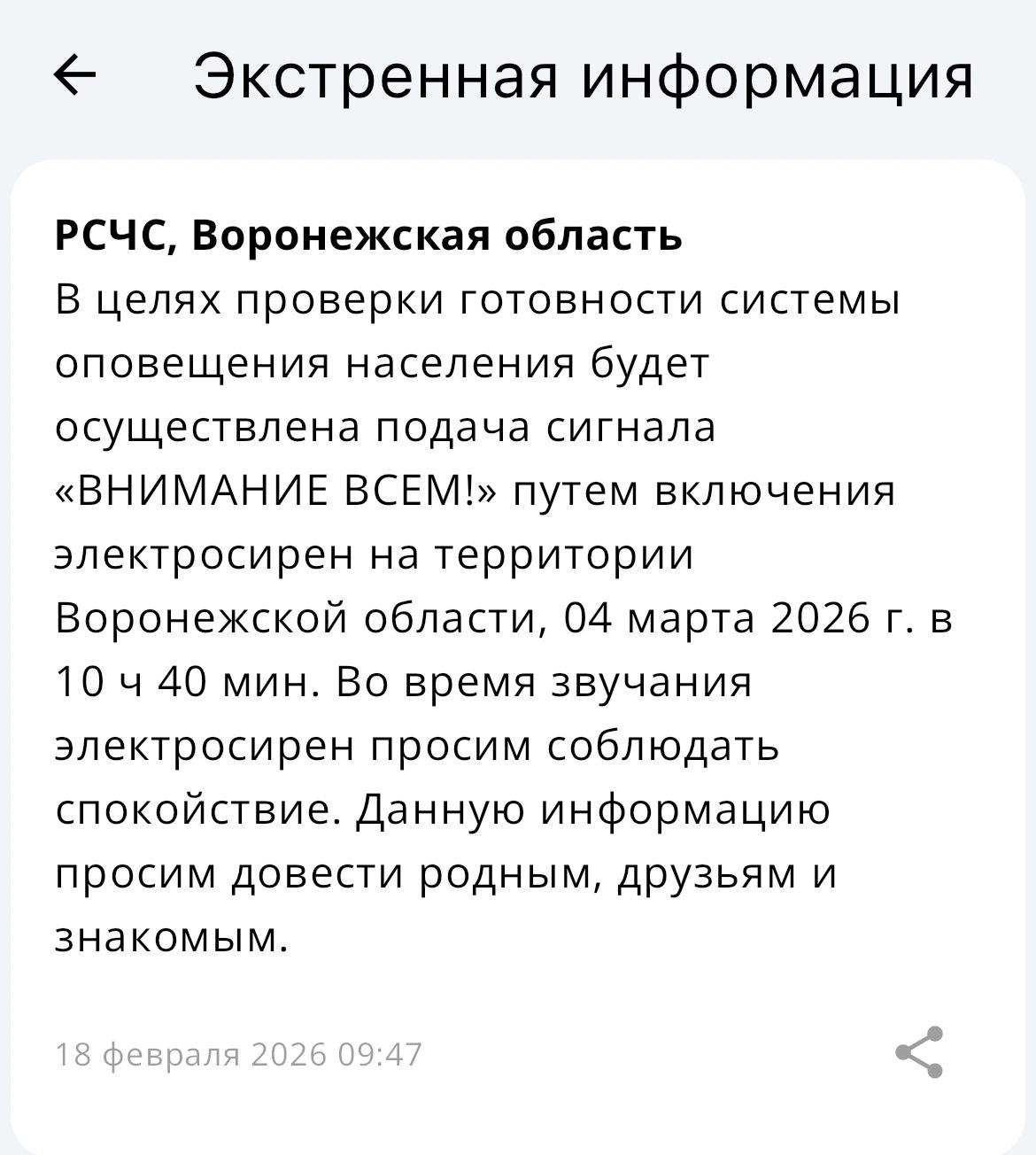 Согласно информации из приложения МЧС, утром 4 марта на территории Воронежской области будет проводиться проверка системы оповещения населения. Сирены будут звучать по всему региону.