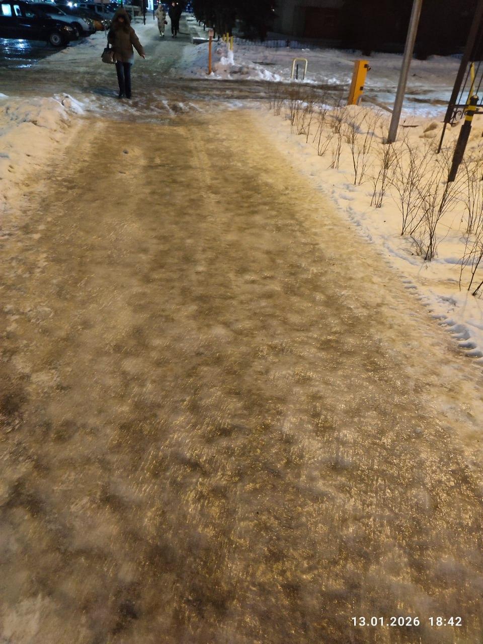— В сторону Дорожной часть тротуаров во дворах посыпаны песком, но в остальном — кошмар какой-то. Колеи жуткие, все это блестит льдом, как отполированное. Когда дорожки из песка обрываются, идти приходится еле-еле, неосторожно шагнешь — точно упадешь, — поделился молодой человек.