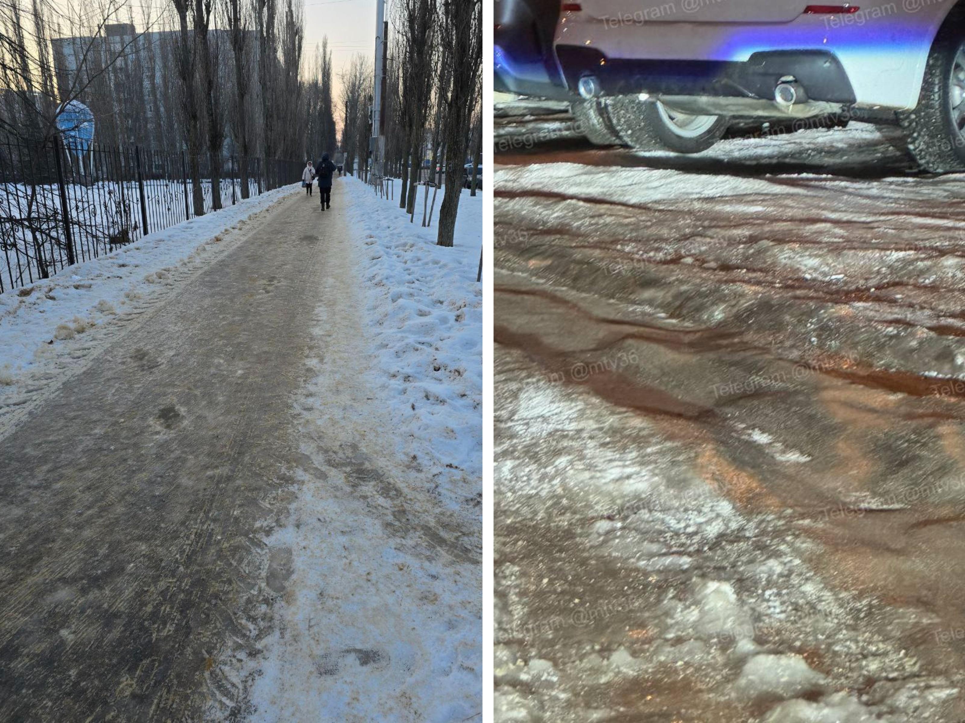 — Вожу сына в 88-ю школу, по тротуару идти невозможно — вместо него зеркало, — поделилась читательница Voronezh1.ru. — Межквартальный проезд на Жукова — ямы и лед. Ни песка, ни очистки.