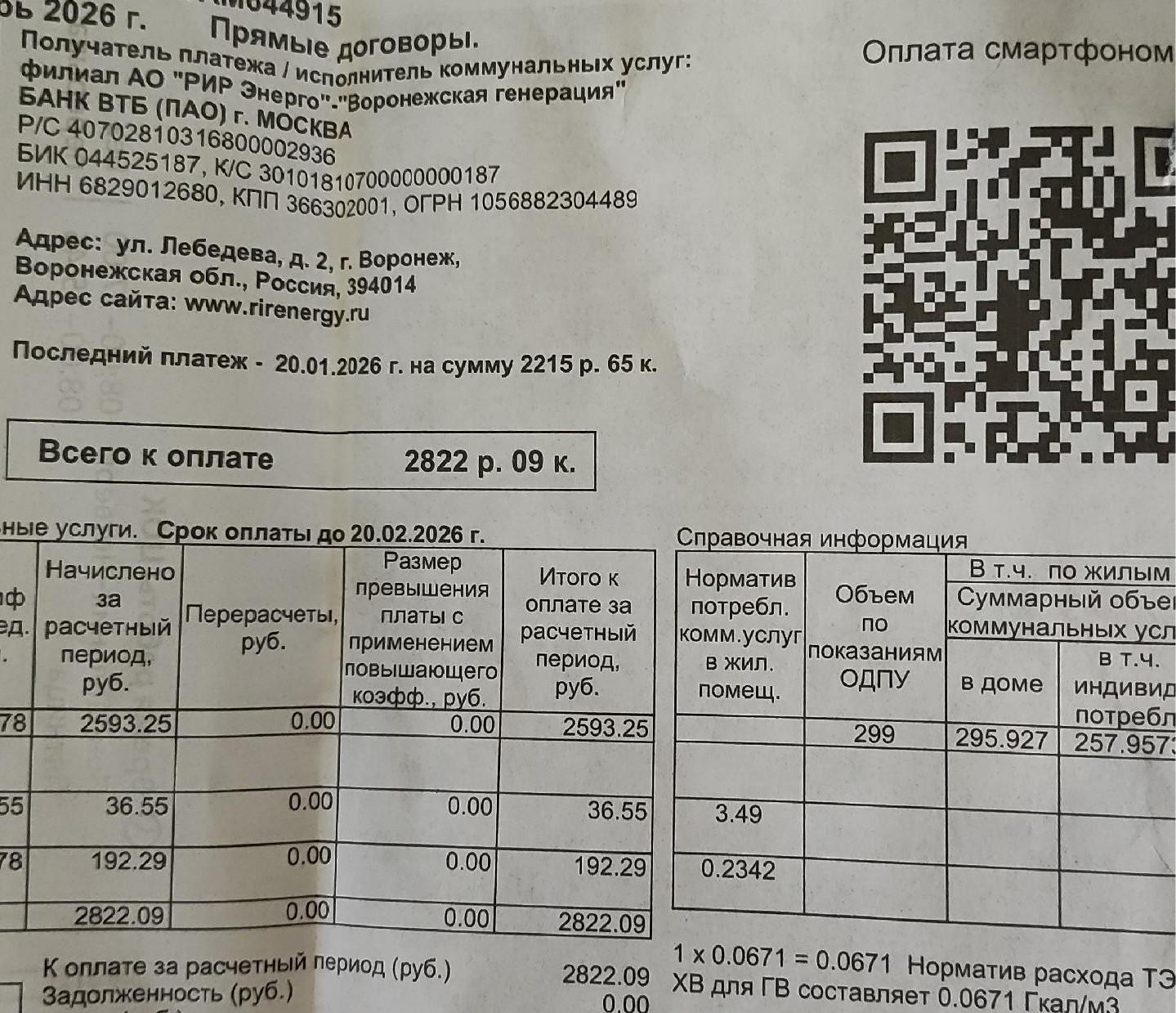 В Воронеже жители столкнулись с резким увеличением сумм в квитанциях за отопление в январе. В качестве примера можно привести ситуацию читательницы Елены, которая проживает в однокомнатной квартире площадью 33,7 квадратных метра в Северном районе города.