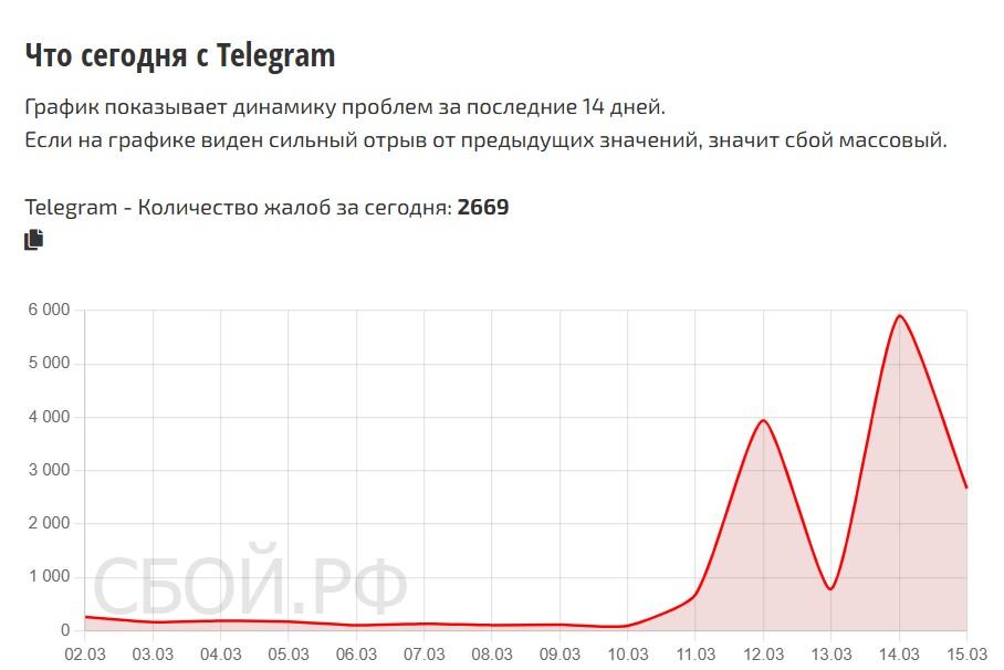 Сервис Сбой.рф зафиксировал 5902 жалобы на неработающий Telegram 14 марта. К 09:31 15 марта поступило ещё 2669 обращений. Согласно данным сервиса, это крупнейший сбой в мессенджере с начала месяца. Наиболее проблемными регионами стали: