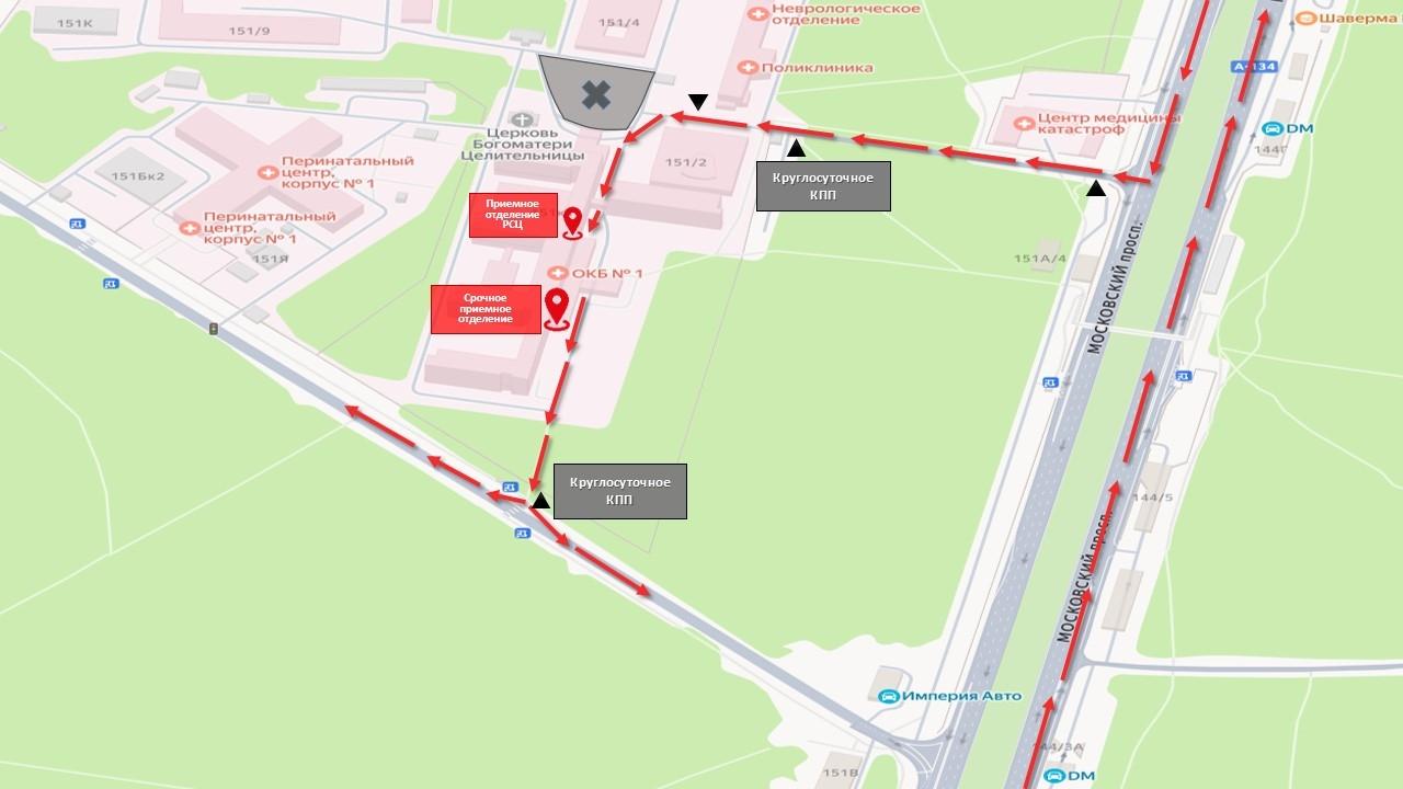 Попасть на территорию медучреждения теперь можно будет только через главный контрольно-пропускной пункт со стороны Московского проспекта. Выезд для всех автомобилей организован исключительно в направлении микрорайона Подгорное.