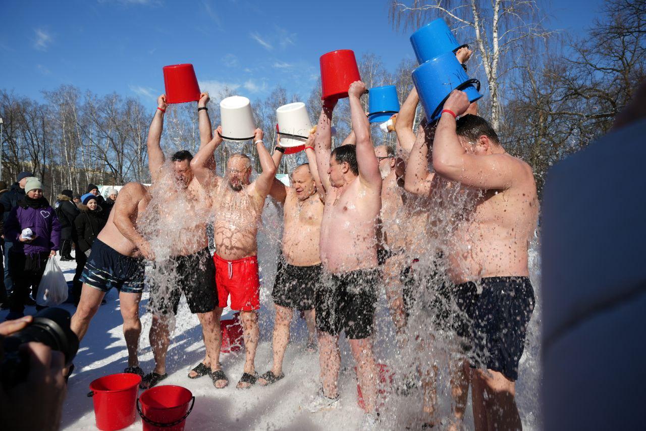 Десятки участников обливались ледяной водой во время масленичного фестиваля.