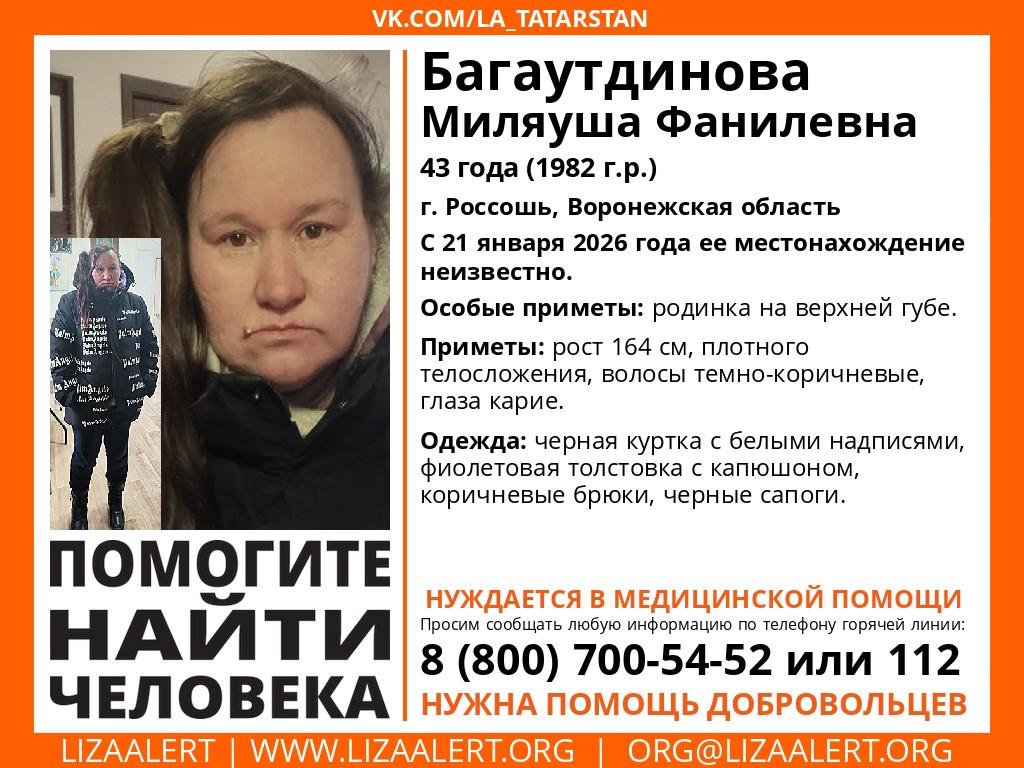 Также в розыске находится 43-летняя Миляуша Багаутдинова, которая пропала в Россоши 21 января. Женщина требует медицинского наблюдения.