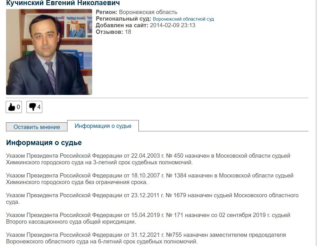 Евгению Кучинскому в случае подтверждения нарушений грозит отставка и конфискация имущества, стоимость которого превышает официальные доходы. Он был назначен на должность заместителя председателя Воронежского областного суда 31 декабря 2021 года сроком на шесть лет. До этого Кучинский работал в Московской области: с апреля 2003 по декабрь 2011 года — судьёй Химкинского городского суда, затем судьёй Московского областного суда, а с сентября 2019 года — судьёй Второго кассационного суда общей юрисдикции.