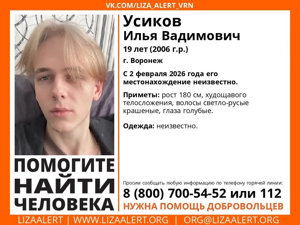 Добровольцы поискового отряда «ЛизаАлерт» объявили о розыске Ильи Усикова 12 февраля. Молодой человек 2006 года рождения пропал без вести со 2 февраля, ему 19 лет.