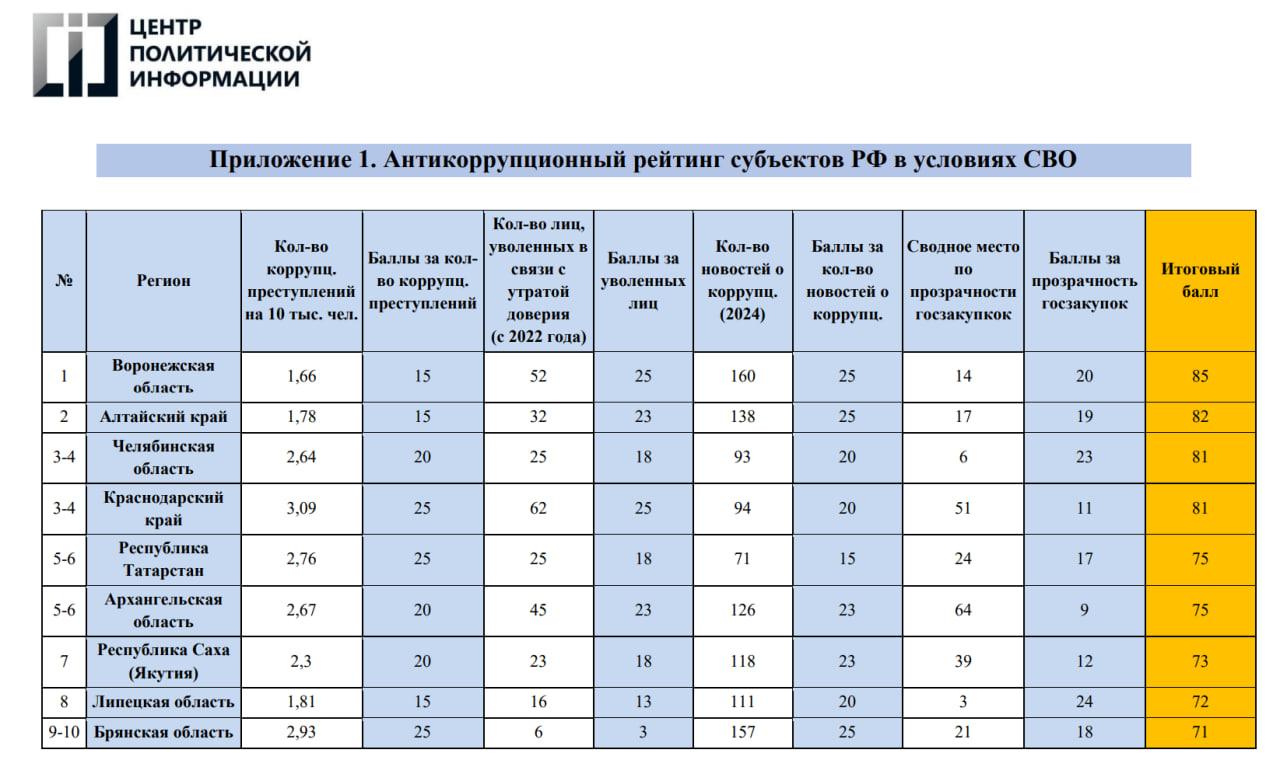 Центр политической информации опубликовал общероссийский антикоррупционный рейтинг, где Воронежская область заняла первую строчку.