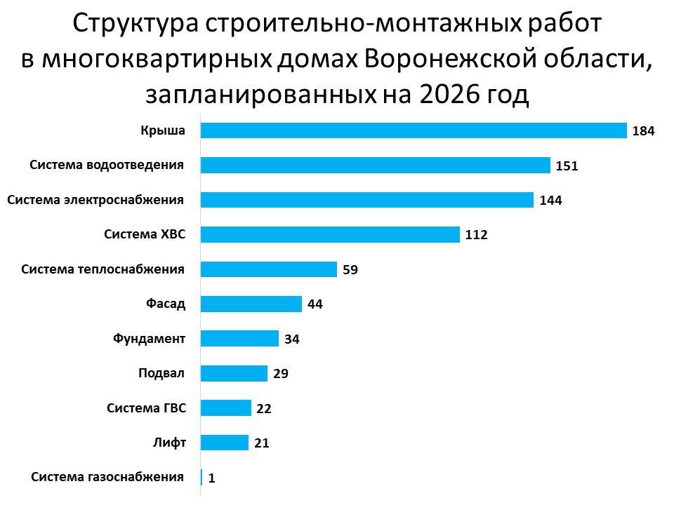 В 2026 году в Воронежской области планируется выполнить 1664 вида работ по капитальному ремонту в 487 многоквартирных домах, из которых 303 расположены в Воронеже. В этих зданиях проживают 54,8 тысячи человек.