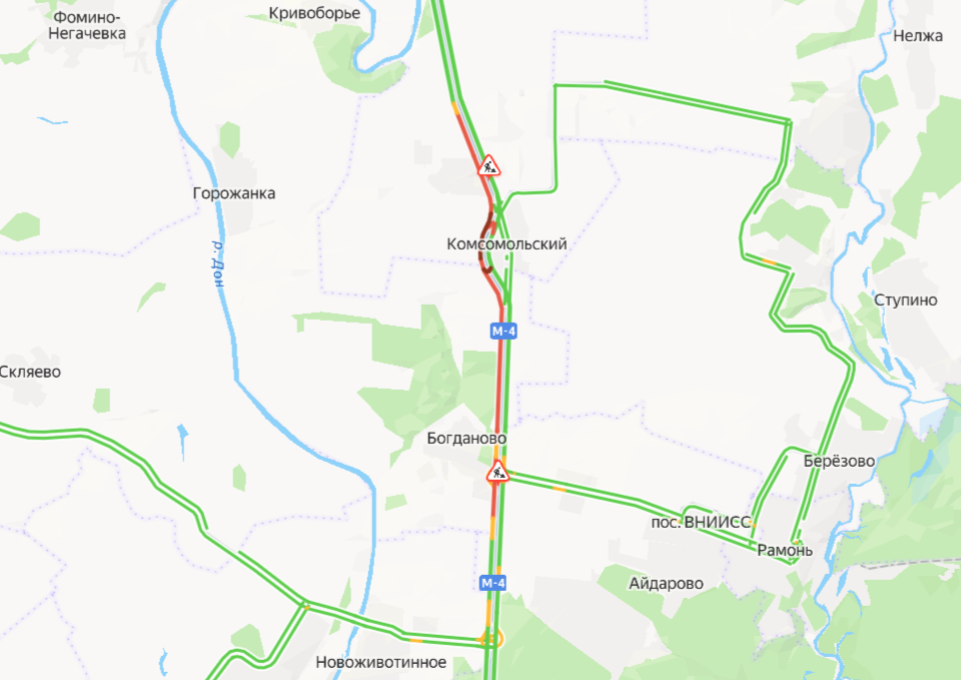 Согласно данным «Яндекс.Карт», к 15:50 затор в направлении Воронежа достиг протяженности примерно 12 километров. Колонна транспортных средств растянулась от поворота к поселку Петровское почти до Новоживотинного.