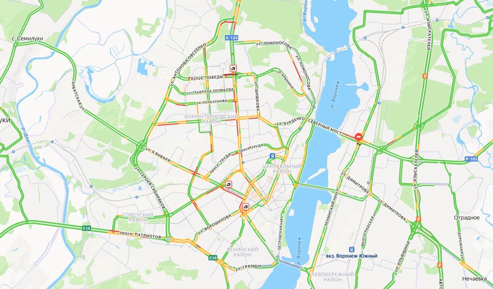 На левом берегу города затор сформировался лишь на подъезде к Остужевскому кольцу со стороны торгового центра «Максимир».