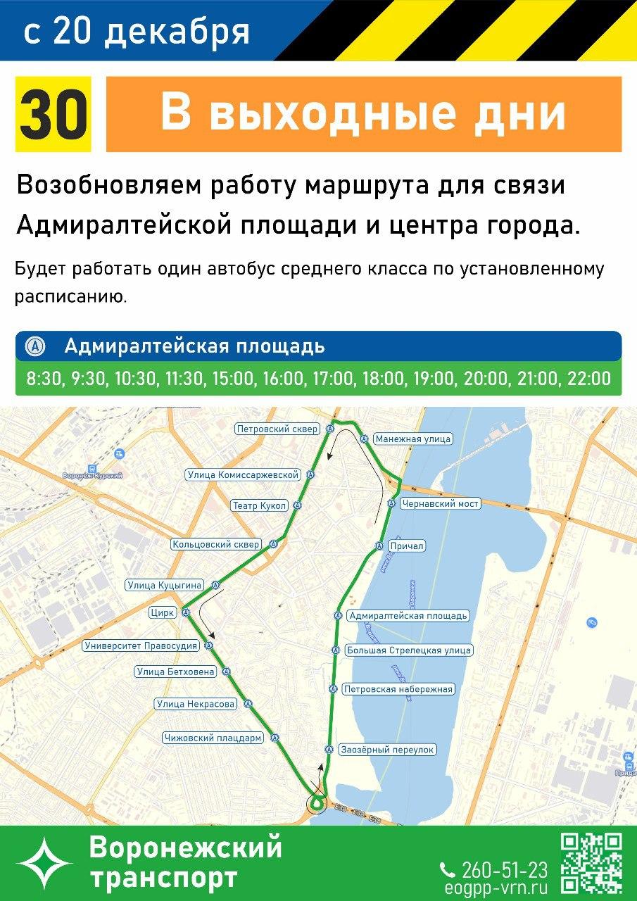 Автобусный маршрут №30 снова начал работу в Воронеже. Его трасса проходит через центр города и заканчивается у Адмиралтейской площади.