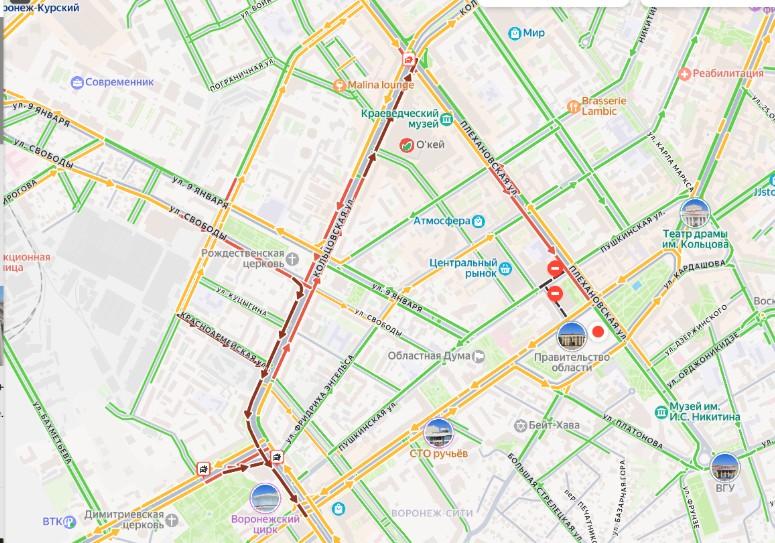 Два дорожно-транспортных происшествия привели к полному перекрытию движения на улице Кольцовской в центре Воронежа. Участок от перекрёстка с Плехановской улицей до здания Цирка оказался непроезжим в обоих направлениях.