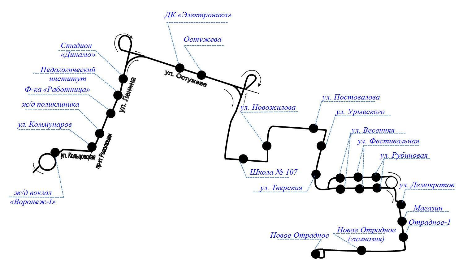 Маршрут № 153 «Воронеж — Новое Отрадное» организует отправление от железнодорожного вокзала «Воронеж-1». Его путь проляжет через остановку «Стадион „Динамо“», улицы Остужева, Новожилова, Урывского, Тверскую, а также микрорайоны Черемушки, Новое Отрадное и поселок Отрадное.