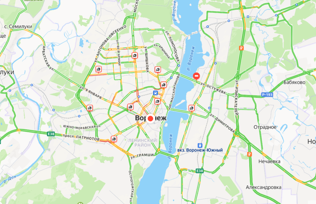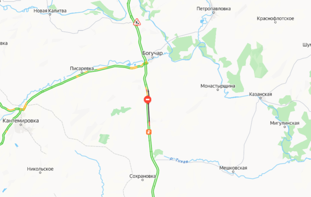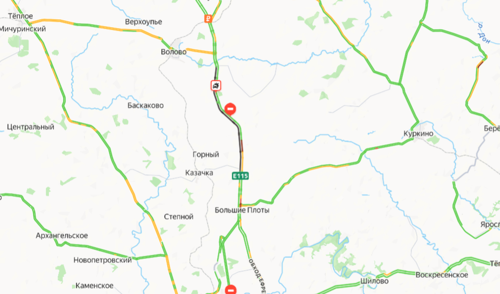 В Тульской области часть магистрали в направлении Воронежа оказалась заблокирована. По данным картографических сервисов, здесь образовалась пробка длиной около 20 километров. Сообщения о затруднениях начали появляться с 10 часов утра, а к 12:30 затор растянулся от поворота к деревне Дворики в Воловском округе до деревни Красавка.