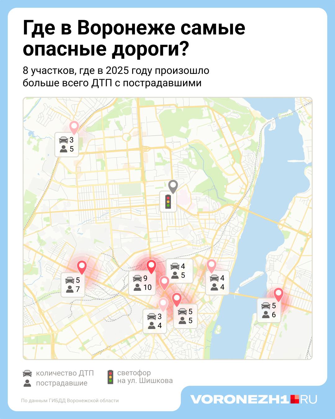 В 2025 году на дорогах Воронежа зарегистрировано 1153 дорожно-транспортных происшествия, в которых пострадали люди. Почти 20% этих инцидентов пришлось на восемь конкретных участков, выделенных Госавтоинспекцией в особый список.