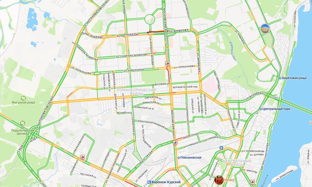Согласно данным «Яндекс.Карт», утром 20 января в Воронеже сложилась сложная дорожная обстановка. Основные затруднения традиционно возникли на Московском проспекте, где около «Пирамиды» затор образовался из-за ДТП с троллейбусом.