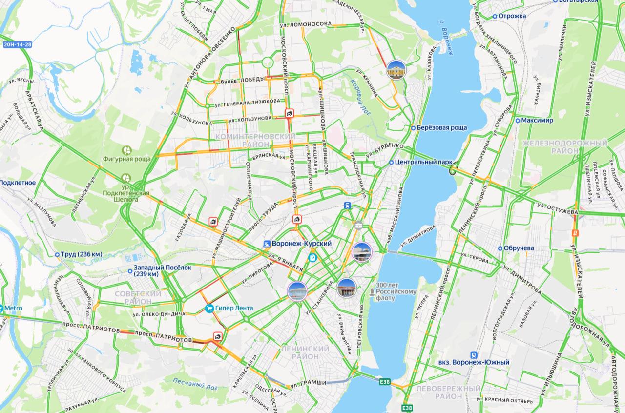 Согласно данным сервиса «Яндекс.Карты», утром 22 января в Воронеже возникли пробки.