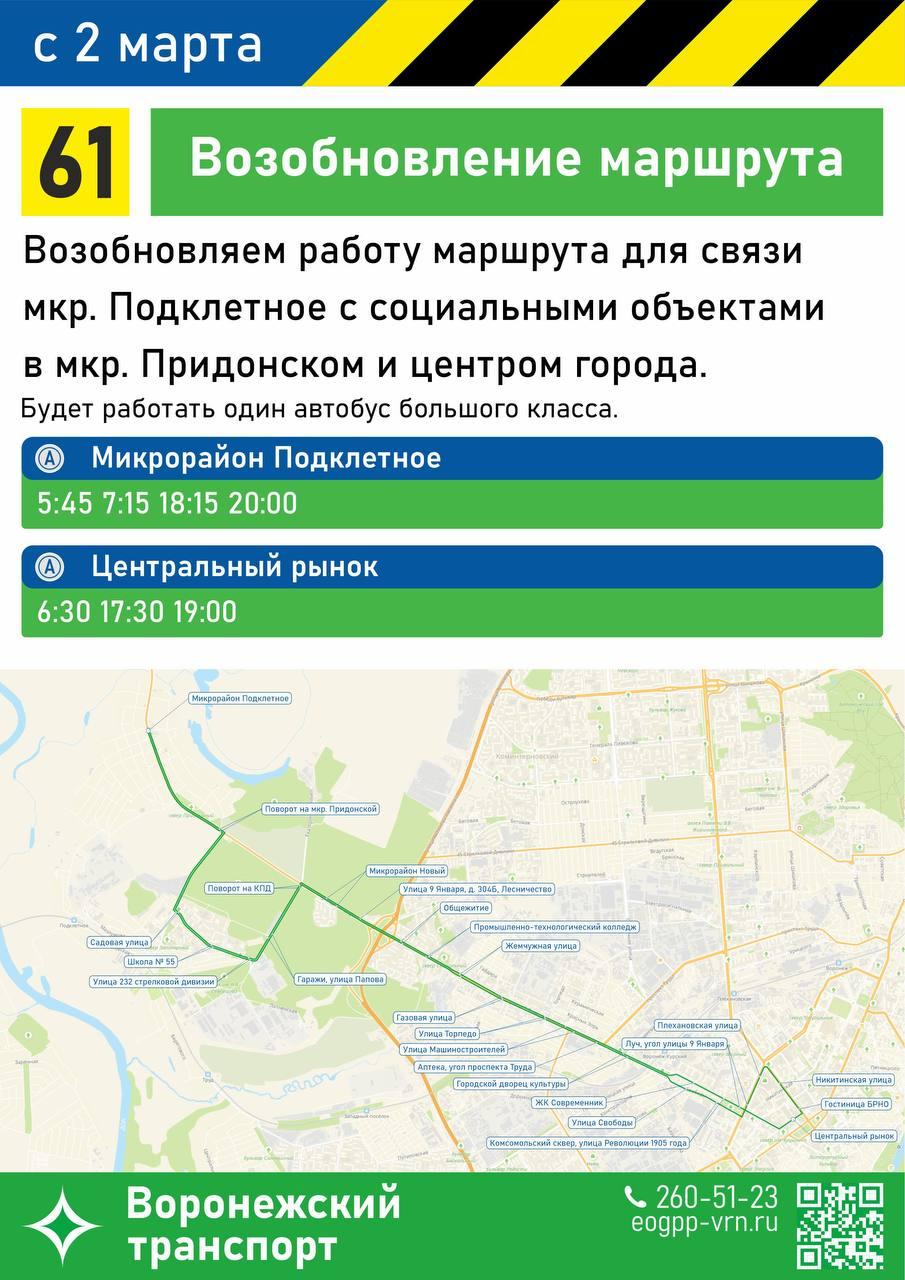 В Воронеже возобновят маршрут №61 и скорректируют расписание №78