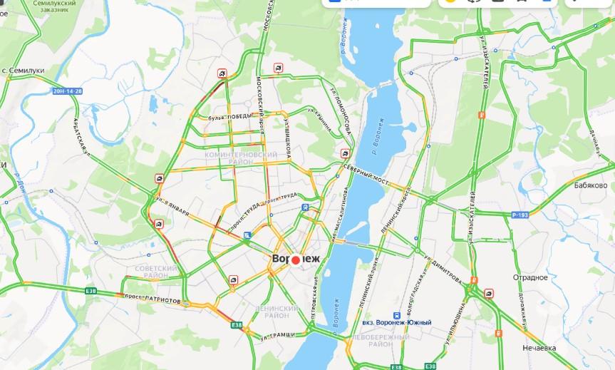 В разных районах Воронежа зафиксировано несколько дорожно-транспортных происшествий. Сервис Яндекс.Карты показывает заторы в 4 балла, но пользователи отмечают неточности в отображении дорожной ситуации. Приложение 2ГИС указывает на 7 красных баллов. Наиболее серьёзная обстановка сложилась на окружной дороге Антонова-Овсеенко, где произошло несколько аварий.