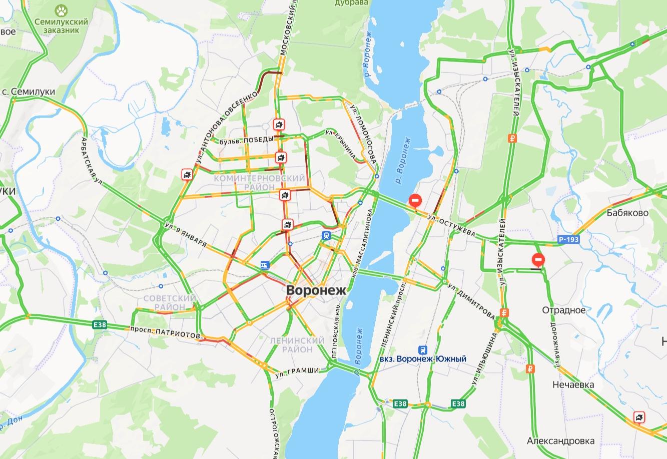 Сервис «Яндекс. Карты» присвоил утренним пробкам в Воронеже максимальную оценку в шесть баллов. Основные трудности для водителей создают дорожные аварии на различных участках.