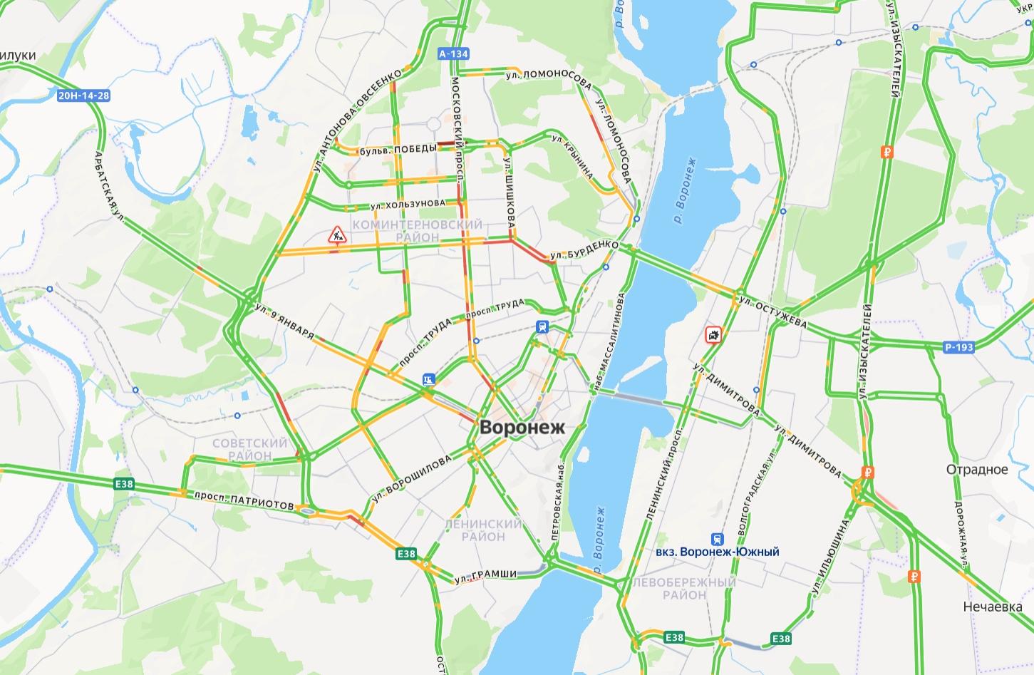 Утром в пятницу, 13 февраля, в Воронеже образовались пробки, о чём свидетельствуют данные сервиса «Яндекс.Карты».