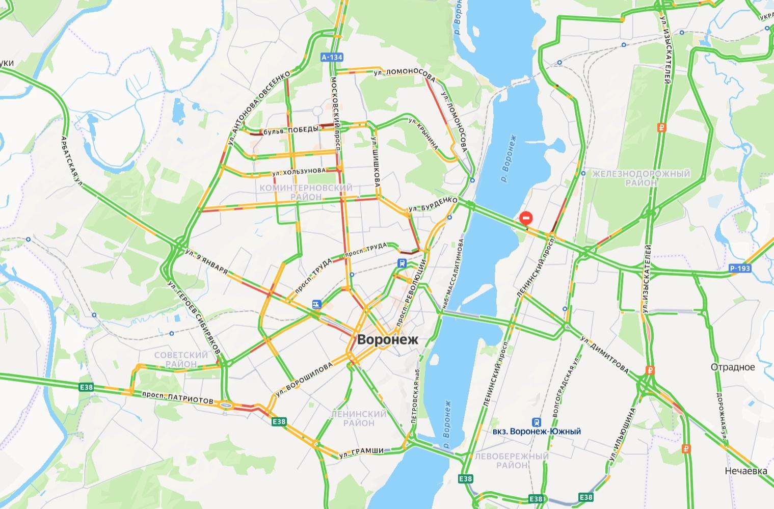 Утром 18 февраля в Воронеже сложилась сложная дорожная обстановка. Информация о масштабных заторах поступает из сервиса «Яндекс.Карты».