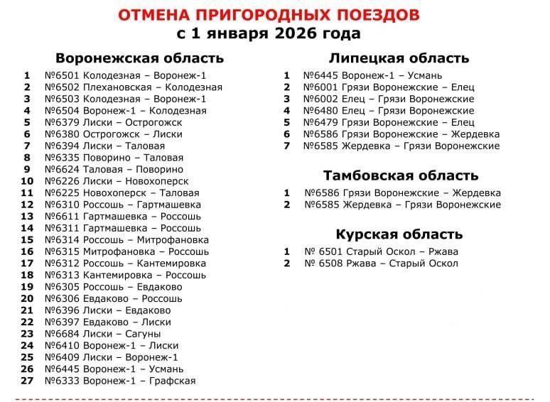 С начала 2026 года в Воронежской области прекратили курсирование 27 пригородных электропоездов. Аналогичные сокращения произошли в соседних регионах: семь маршрутов отменили в Липецкой области, по два — в Тамбовской и Курской.