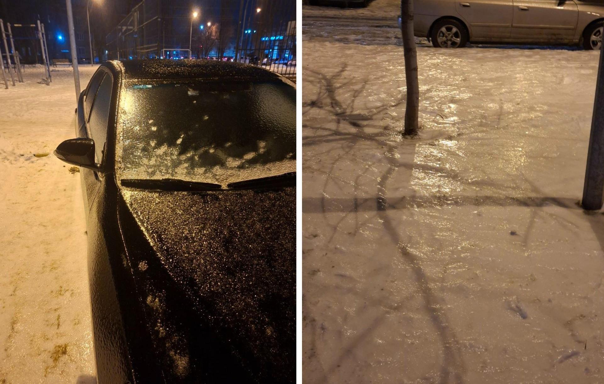 Ледяная корка покрыла тротуары, автомобили и снежные сугробы в Воронеже.